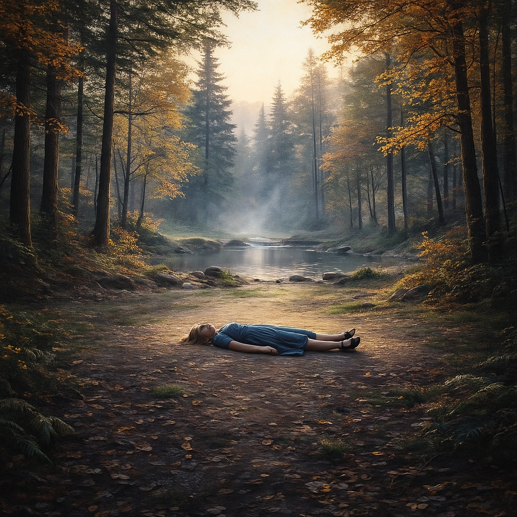 Au centre de la clairière, là où l’herbe formait un tapis vert parsemé de feuilles rousses, gisait le corps d’une femme.